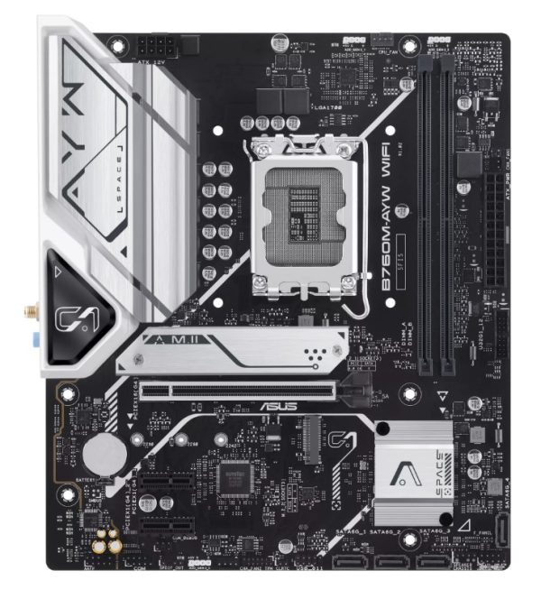 ASUS B760M-AYW WIFI, an Intel® B760 LGA 1700 mATX motherboard with PCIe 4.0, two PCIe 4.0 M.2 slots, DDR5, Realtek 2.5Gb Ethernet, WiFi 6, HDMI™, SATA 6 Gbps, front USB 3.2 Gen 1, Aura Sync