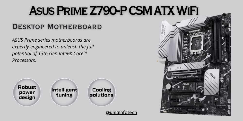 ASUS Prime series motherboards are expertly engineered to unleash the full potential of 13th Gen Intel® Core™ Processors. Boasting a robust power design, comprehensive cooling solutions and intelligent tuning options, PRIME Z790-P WIFI-CSM provides users and PC DIY builders with a range of performance optimizations via intuitive software and firmware features.