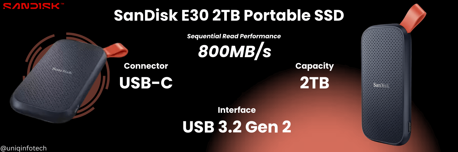 With the SanDisk 2TB Portable SSD, you can store and retrieve your valuable data and media. With a 2TB storage capacity and a 10 Gb/s USB-C 3.2 Gen 2 interface, this portable SSD blends in perfectly with your mobile lifestyle. You will get speedy access to your files with read speeds of up to 800 MB/s. It may be fastened to your belt loop or backpack with its built-in rubber hook, and it is bus powered and drop resistant up to 6.6 feet. A limited 3-year guarantee offers protection, and a USB-C to USB-A converter is supplied.